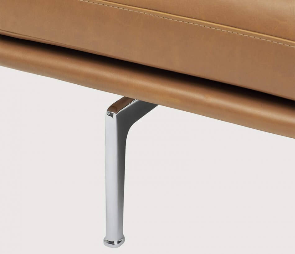 Son piètement, contribue par sa légèreté à la forte identité visuelle de la collection, est disponible en noir et en aluminium poli.