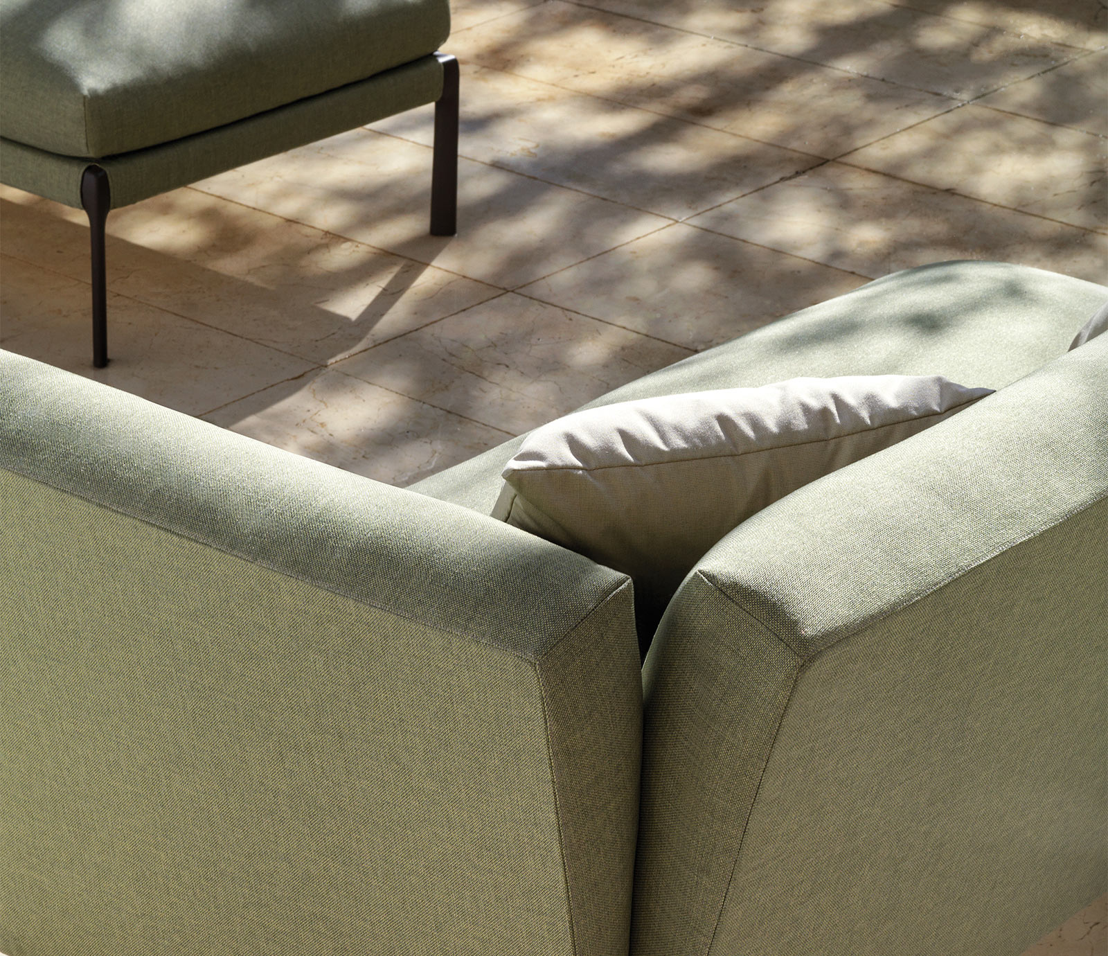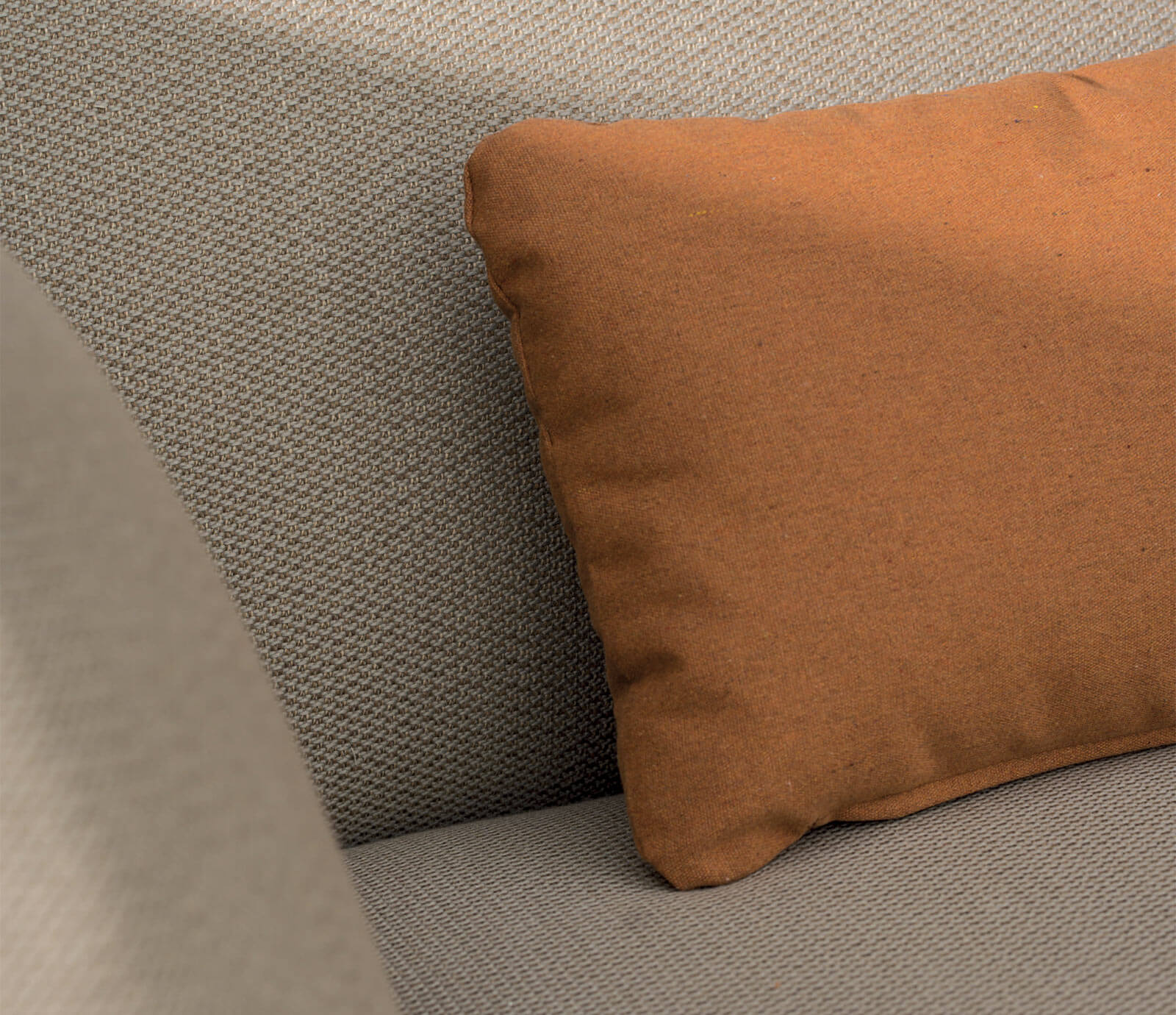 L’assise repose sur des sangles élastiques haute résilience, typiques du mobilier indoor, ici retravaillées pour l’extérieur. Elles soutiennent des coussins à base de polyuréthane, revêtus de tissus outdoor disponibles en de nombreux coloris et finitions, permettant une personnalisation selon les préférences et la disposition des espaces.